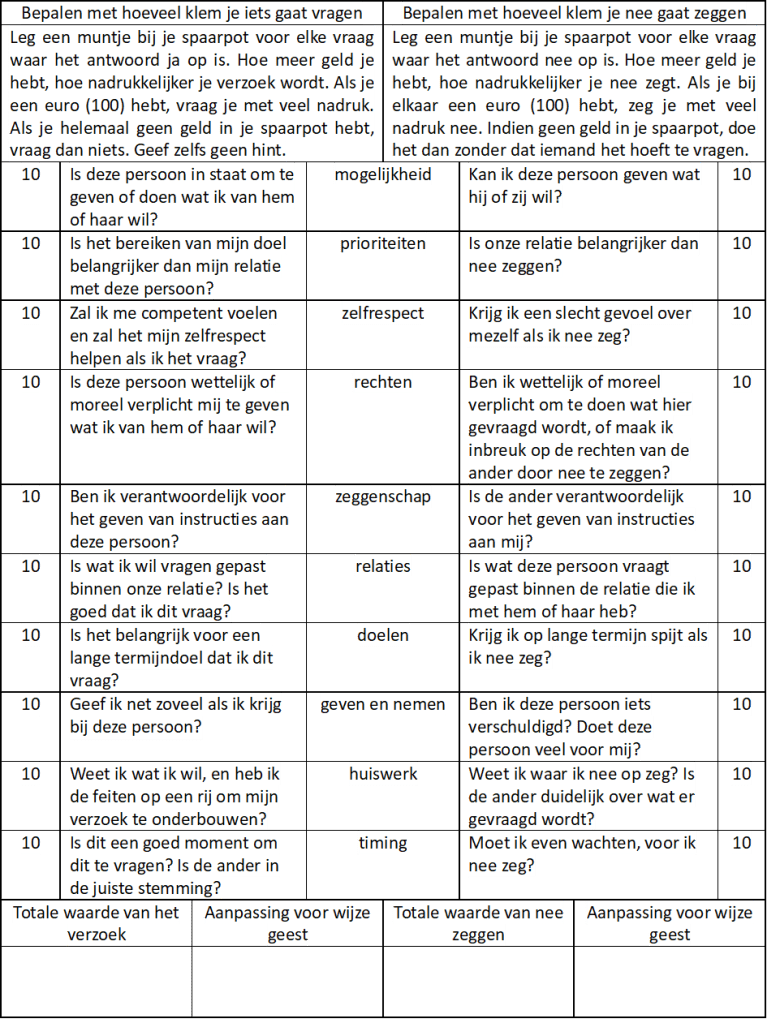 Lees onderstaande instructies om erachter te komen hoe nadrukkelijk je ‘verzoek’ of je ‘nee’ moet klinken. Omcirkel de muntjes van 10 die in jouw spaarpot komen en tel ze uiteindelijk op. Neem daarna de lijst nog eens door om te kijken of er items zijn die veel belangrijker zijn dan andere. Check het in wijze geest voordat je tot handeling overgaat, als er items zijn die veel belangrijker zijn dan andere.