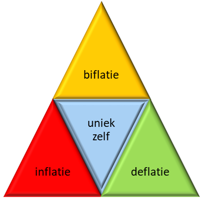 Herstel- en/of groeiprocessen zijn zoals altijd individueel te doorlopen, biflatie als katalysator helpt aanzienlijk om dit proces te versnellen. Dit genoopt een aantal kanttekeningen om niet tot te voorbarige conclusies te komen, meer een zaak van de geesteswetenschappen dan dat we hier als leken enige expertise zouden willen pretenderen. Toch leent het beeld zich om een dynamiek te bespeuren die zonder onderzoek vaak aan de collectieve aandacht ontsnapt. In het (te) kort, vanuit de courante these-inflatie (rood) kunnen we middels introspectie via de antithese-deflatie (groen) naar de synthese-biflatie (oranje) evolueren, non-lineair centraal.