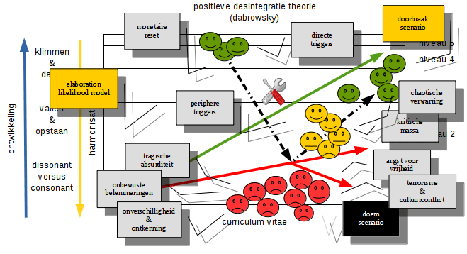 Recapitulerend, wat begint bij een schijnbaar banale oefening kan uitmonden in een avontuur waar misschien ook geen einde aan komt. Dit brengt ons tot de positieve desintegratie theorie waarin onthechting centraal staat, als een poging om vigerende paradigma’s te overstijgen en/of ontrafelen om zodoende meer verbinding en harmonie na te streven. Veel hiervan is echter koffiedik kijken en afhankelijk van veel randvoorwaarden, gefaciliteerd door positieve bekrachtiging en/of non-lineaire katalysatoren ingebed binnen een verscheidenheid aan stromingen die niet zelden auto-conform vijandige spanningsvelden onderhouden. Om kort te zijn, alwaar Ockhams scheermes vereenvoudiging en hoop voorspiegelt, lopen we tegelijk het risico om te verzanden in complexiteit zonder enige zekerheid wat betreft de toekomst.
